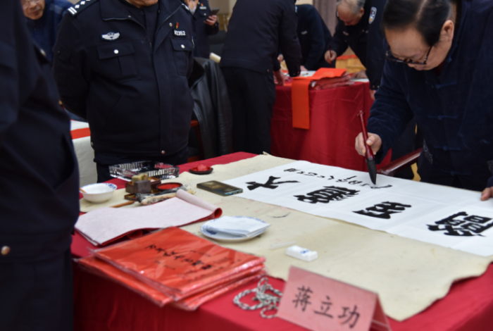 活动现场,中书协会员、安徽省书协副主席刘云鹤,省书协副主席蒋立功,书画家年介忠,书法家施保群等多位艺术家们挥毫泼墨,笔走龙蛇。一幅幅寓意吉祥的春联在他们的笔下诞生,一个个饱满厚重的“福”字跃然纸上。“春满人间百花吐艳,福临小院四季常安”“一帆风顺吉星到,万事如意福临门”等春联内容,不仅承载着对新年的美好期许,也表达了对民警们的诚挚祝福。