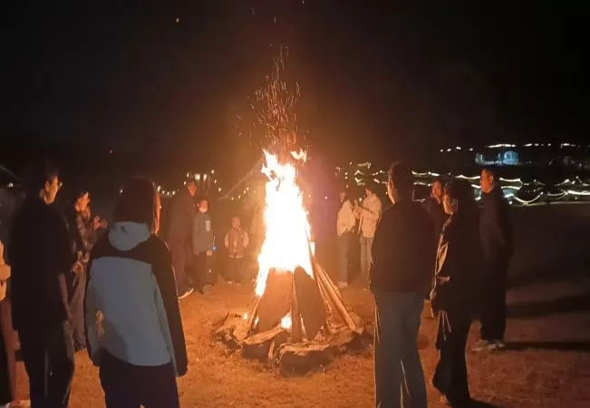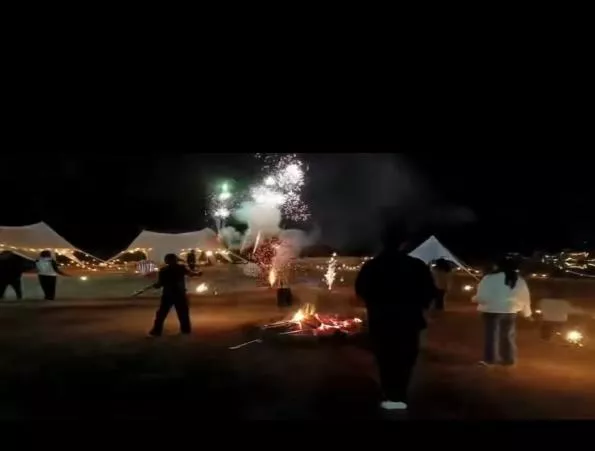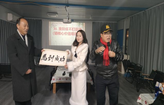 进入园区后迎接我们的是园区负责人章女士。她热情洋溢地向笔者介绍了园区跨年活动的详情。她说:我们今天安排的跨年活动是,篝火,烟花音乐晚会及烧烤畅享,猜灯谜大奖等。我们用最低成本,最浪漫最热情的服务项目惠顾社会邀迎来宾。我们是通过抖音,美团,小红书这些网络平台宣传推介的。今晚的活动大概有四十到五十人参加,因为天气等原因活动规模不大。我们还迎来了重要嘉宾,肥西县园艺研究会会长马志勤先生和合肥市非遗灯谜传人骆岩先生,安徽魁酒酒业董事长陆玉玺先生等参加晚会活动。