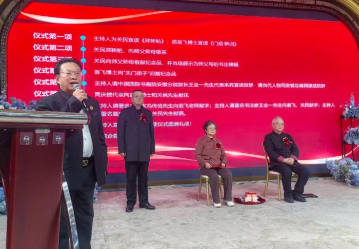 仪式在李军主持下,按中国传统拜师礼进行。关民先生在宣读《拜师帖》后,恭恭敬敬地将《拜师帖》举过头顶,敬献给师父翁飞,并向师父师母敬茶,送上他近几年创作出版的六本专著和亲自撰写的书法作品《亦师亦友》。
