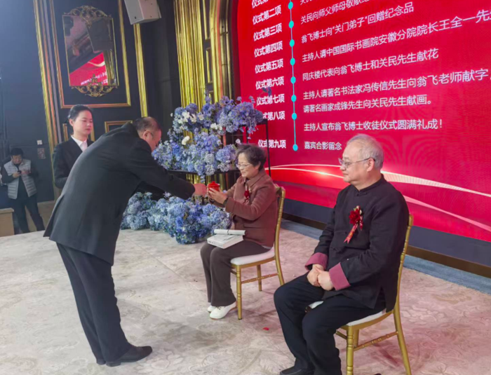 拜师礼结束后,著名书法家王全一先生、冯传信先生与著名画家成锋先生、崔学坤先生、王玉海先生的代表分别向翁飞博士和关民先生,赠送了书画作品,以示纪念。
