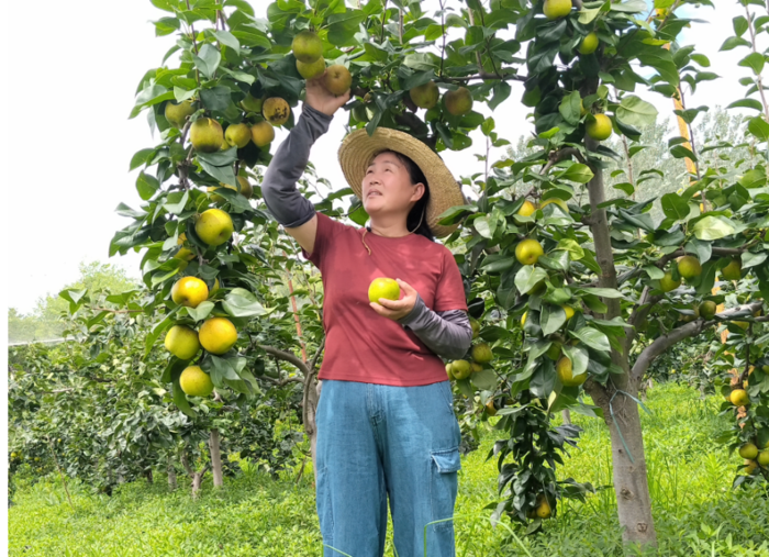 瞧,这青枝绿叶果园里的梨树都修成‘开伞’的模样,树高不超过2米,既通风透光,又方便游客采摘。”方玲说:“每逢7月采梨季节,这里都会有不少客户、团建,还有商超店主慕名前来采购,日均采摘1500多斤。”