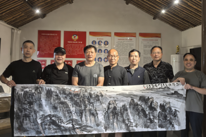 8月1日 ,阴雨绵绵,在肥东县桥头集镇国光社区黄张村“无界茶舍”屋内,灯光炽热而明亮,这里正在举行庆祝“八一建军节”书画创作交流暨安徽古塬书画院邦和乡村分院创作基地揭牌仪式。此次活动吸引了众多书画名家、艺术爱好者和部分村民,欢聚一堂,共襄见证这场艺术与文化交流的完美融合。
