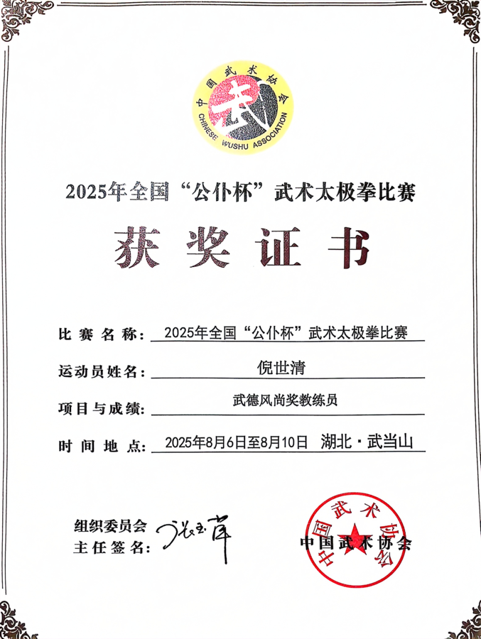 在此次大赛中,安徽代表队世清太极文化研究会表现出色,面对30余支劲旅,凭借精湛的技艺和出色的表现,成功斩获集体项目器械(春秋大刀)一等奖,并荣获全场唯一《最佳表演奖》。此外,倪世清老师还荣获《武德风尚奖教练员》称号,这份佳绩充分展现了安徽世清太极研究会实力与风采。