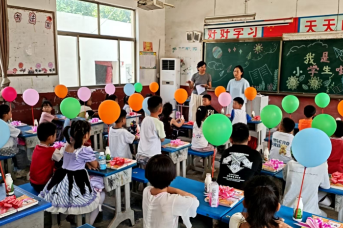 “小朋友你好呀!欢迎来到刘寨小学!” 随着一声声亲切的问候,新生开学活动正式拉开帷幕。工作人员为每位踏入校园的一年级新生递上精心准备的 “开学大礼包”—— 礼包内,崭新的课本用红色扎带整齐捆扎,封面贴着印有学生姓名的专属标签,方便孩子们快速识别自己的书本;一瓶口感清甜的钙奶被细心的老师放在每一个同学的课桌上,为孩子们补充能量;最受孩子们喜爱的,是一只印着卡通字样的彩色气球,松手后,气球冉冉升起,带着孩子们的好奇与憧憬,在校园上空形成一片五彩斑斓的 “气球海洋”,不少孩子兴奋地拉着气球绳,蹦蹦跳跳地向教室走去。