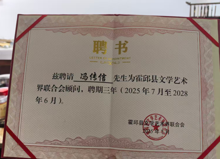 近日,安徽省知名书法家、文化名人冯传信院长被霍邱县文学艺术界联合会授予顾问职务,以表彰其在文学艺术领域的杰出贡献。
