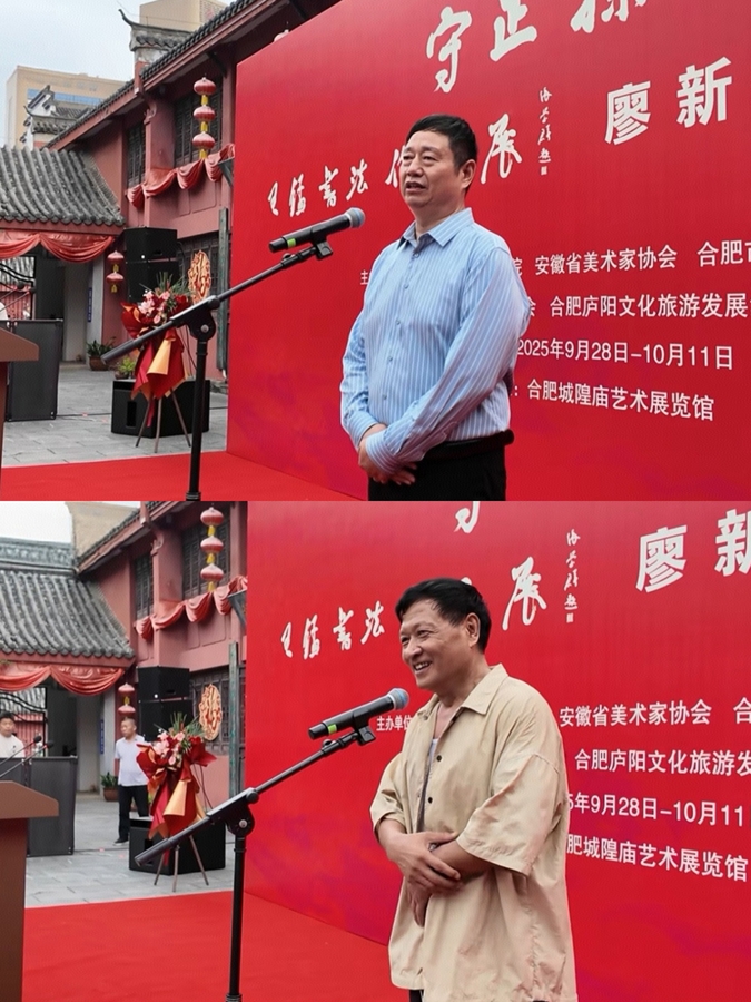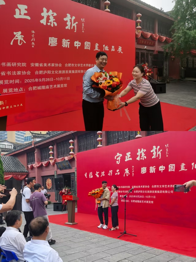 金秋送爽,丹桂飘香。国庆 76 周年的欢歌与中秋佳节团圆的盛大时刻,整个华夏大地沉浸在一片喜庆祥和之中。值此佳节,一场艺术盛宴——《守正探新》王锰书法作品展、廖新中国画作品展于 2025 年 9 月 28 日在合肥城隍庙艺术展览馆华丽启幕,为国庆的喜庆氛围更添绚丽色彩。