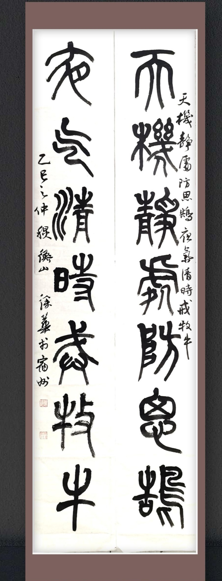 篆书创作中,徐华更实现了“以动破静”的艺术突破,让这一最古老的书法体系获得新生。他广采《毛公鼎》的凝重浑厚、《泰山刻石》的端庄伟岸与《天发神谶碑》的奇崛生动,遵循“写篆书要如青铜铸字,笔笔如凿”的创作理念,作品给人“铸铁成字”的视觉震撼,每一笔都仿佛能听见金属与石头的碰撞声。