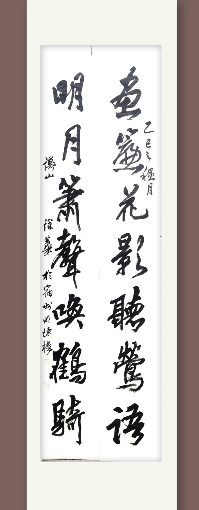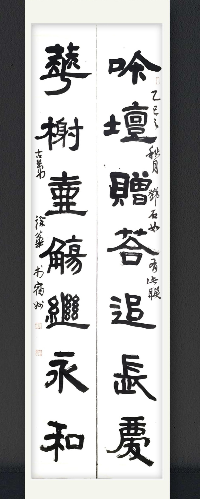 在合肥某公园的巨幅诗屏中,他以八尺素宣书写武风先生《咏梅》,墨韵与诗意辉映,将传统隶书注入现代审美意韵,让古老字体焕发出时代光彩,这种“旧瓶新酒”的处理彰显了成熟艺术家的创造性智慧。