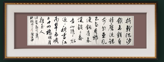 在书写王维《终南山》时,笔锋游走间墨色如流云漫过宣纸,行笔似山涧清泉跌宕生姿,将“白云回望合,青霭入看无”的苍茫山色凝于横竖撇捺之间,完成书法与唐诗的深情对话。楷书创作则以欧阳询险劲为骨,褚遂良宽博为肉,颜真卿雄浑为气,在宁国宾馆“溪水江南”等作品中,法度严谨而不失生动,恰如其所言“楷书如人站立,须堂堂正正”,折射出书家的人格追求。