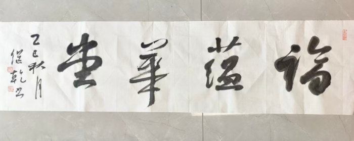 章法与墨法的精妙运用,更让杨继乾的作品兼具视觉张力与意境深度。无论是大幅长卷还是斗方小品,他都能做到疏密有致、虚实相生。毛笔作品中,墨色的浓淡干湿随情感起伏变化,在“力透纸背”的线条质感中完成意境的二次创造;隶书作品结体方正平满,波挑含而不发,在“增一分则长,减一分则短”的精准中尽显中和之美。