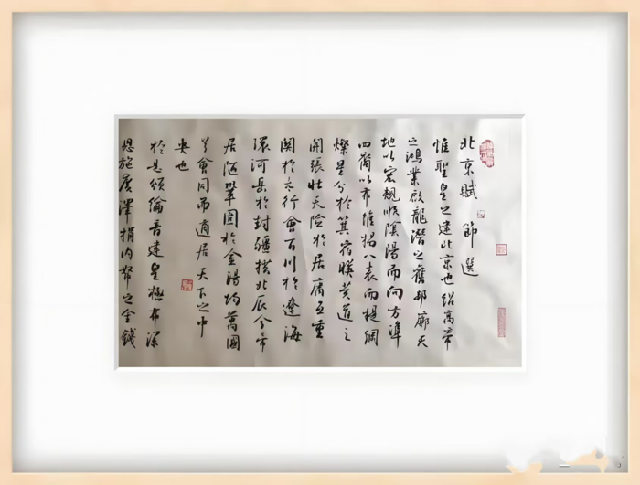其楷书最得褚体精髓却又自成面貌,将皖北大地的厚重融入褚遂良的清瘦,形成“瘦硬中见绵韧”的独特风格。横画起笔如刀削果断,收笔却含含蓄顿挫;竖画如孤松立崖,挺拔中暗藏弹性;撇捺如仙鹤展翅,舒展而不失法度,字字如琢玉般端庄又富灵性,彻底摆脱板滞之态。行书则尽显“二王”一脉的温润多姿,起笔多有方折之力,转折处善用圆转之妙,点画间虽无明显牵丝却笔意不断,如《北京赋》中“行云流水,一气呵成”,在“清风”二字的轻盈与“山河”二字的沉雄间,完成情感与意境的精准传递。