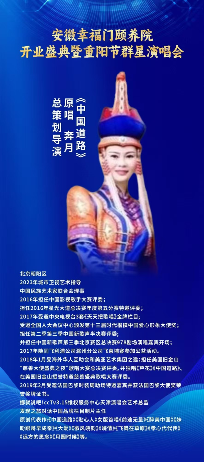 青年歌手奔月,北京朝阳区2023年城市卫视艺术指导,中国民族艺术家联合会理事,拥有丰富的舞台经验和广泛的知名度和影响力。她曾担任2016年影视歌手大赛评委,以及星光大道总决赛年度第五分赛特邀评委。2017年,奔月受邀中央电视台3套《天天把歌唱》金牌栏目,并在全国人大会议中心获得第十三届时代楷模中国爱心形象大使奖。